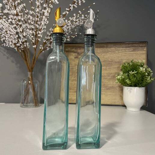 The bottles are made with recycled glass and are BPA and lead free glass and measures 12.25"h x 2.25"w with the spout. The pour spouts are made with stainless steel and are available in either gold or silver.