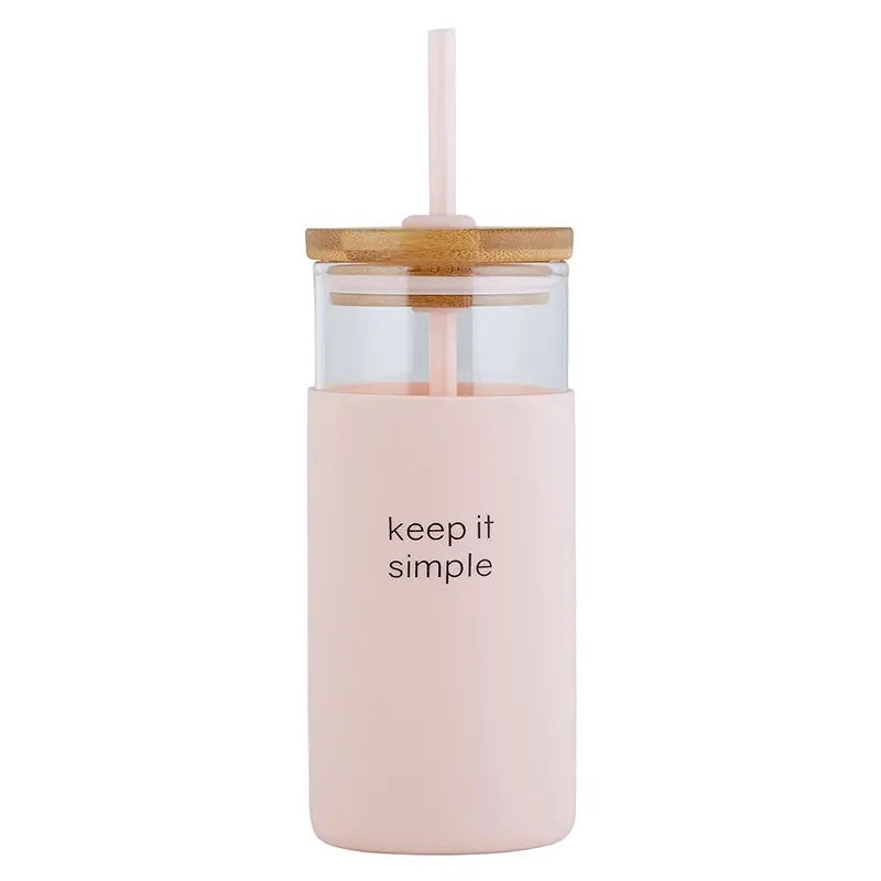 Indulge in your favorite beverage in style with this 18-oz "Keep It Simple" glass featuring a silicone bamboo lid and plastic straw. Perfect for any occasion, whether it's at home or on the go.