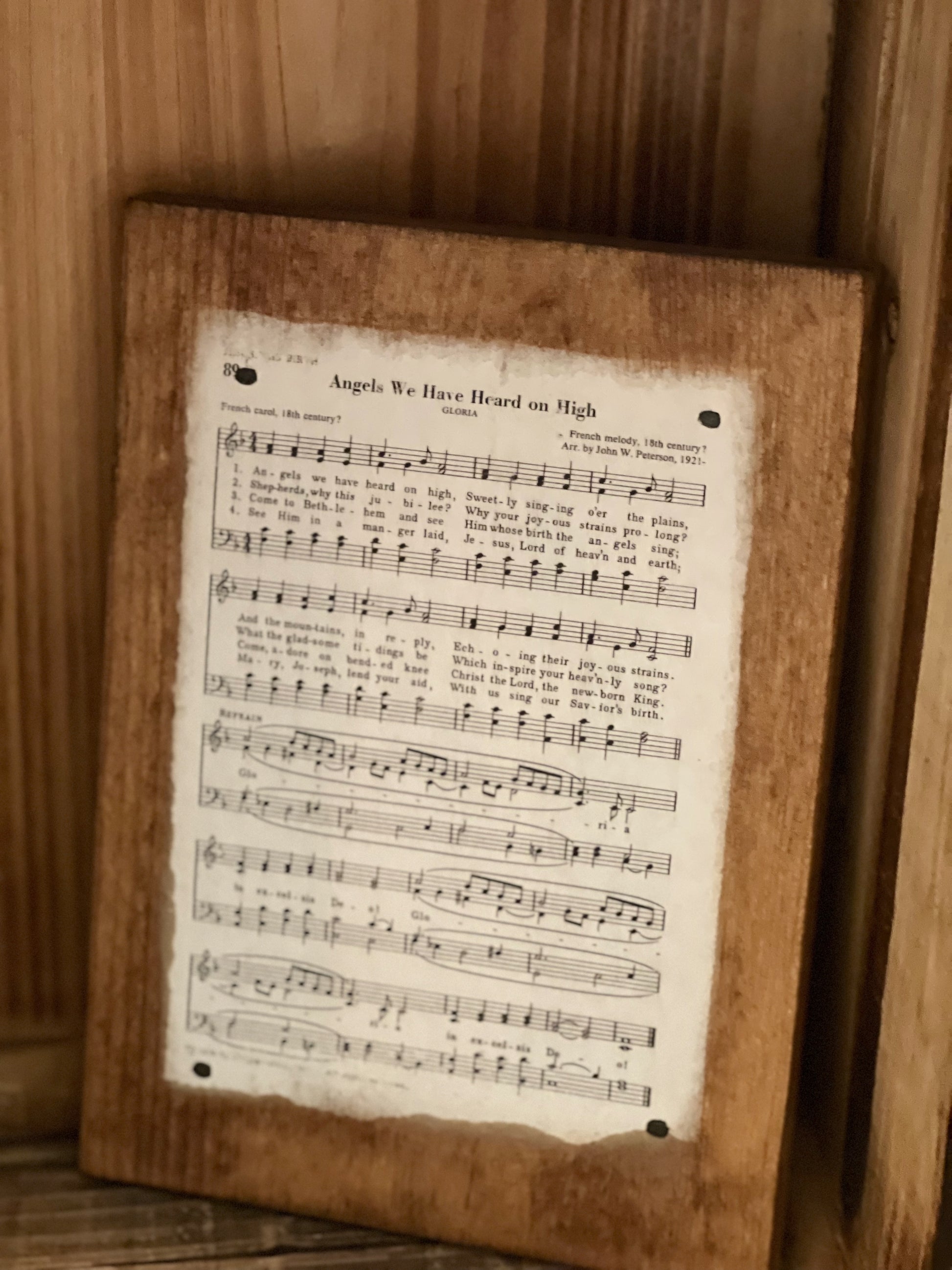 This 7.25" x 10" wooden plaque featuring the song 'Angels We Have Heard on High' is distressed and detailed with small black antique-style tacks, making it perfect as a decorative shelf piece. It can stand on its own.