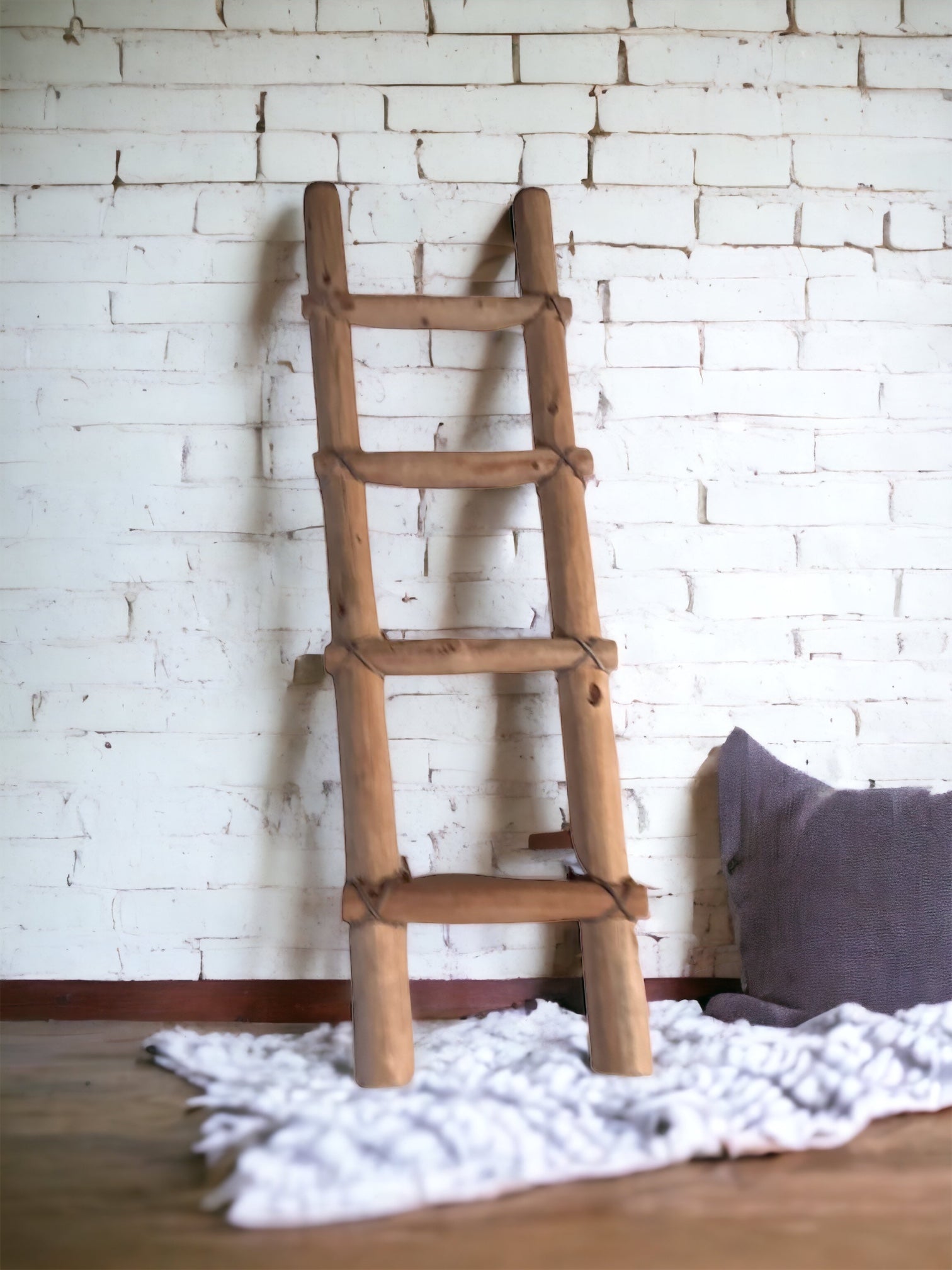 Bring an old-world charm to your home décor with this Handmade Farmhouse Kiva Ladder This unique wooden ladder is skillfully crafted and designed to be sturdy and stable. The rustic, farmhouse design adds a timeless look to any interior, while the natural texture and color enhance the overall atmosphere. This handmade ladder is perfect for displaying blankets, sheets, and towels.
