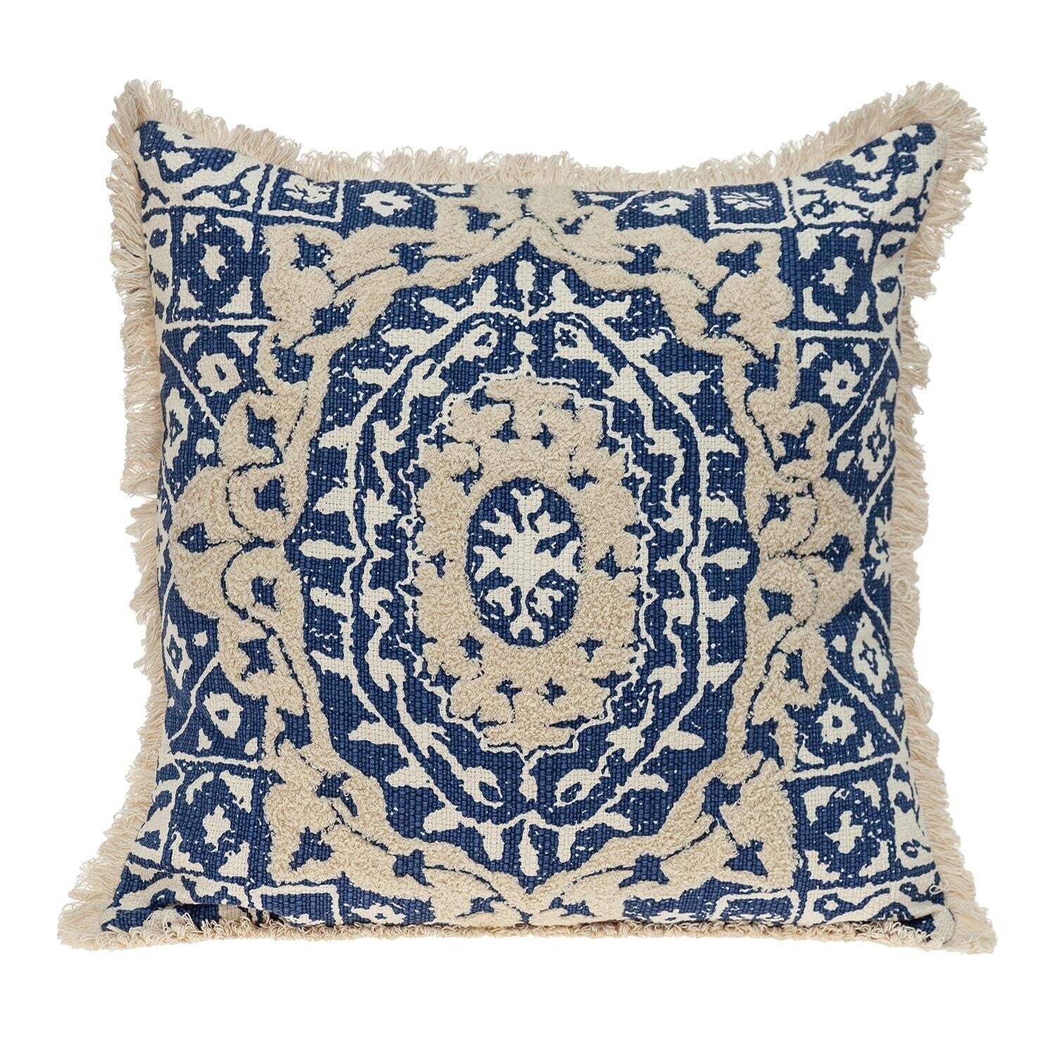 Bohemian in style with a hint of tribal thrown in, this Boho Garland Beige and Navy Blue Decorative Accent Pillow is a great way to bring good vibes softness into your space. This square accent pillow features a 100% cotton textured high and low detailing on the front in beige and a distressed navy blue decorative garland abstract floral design. Soft beige fringe finishes this cool pillow off on all four sides. Attractive and comfortable this decorative pillow is great for the bed, sofa, or your favorite chair. The solid backside includes a flap disguising a zipper for easy insertion/removal of the soft polyester filling.