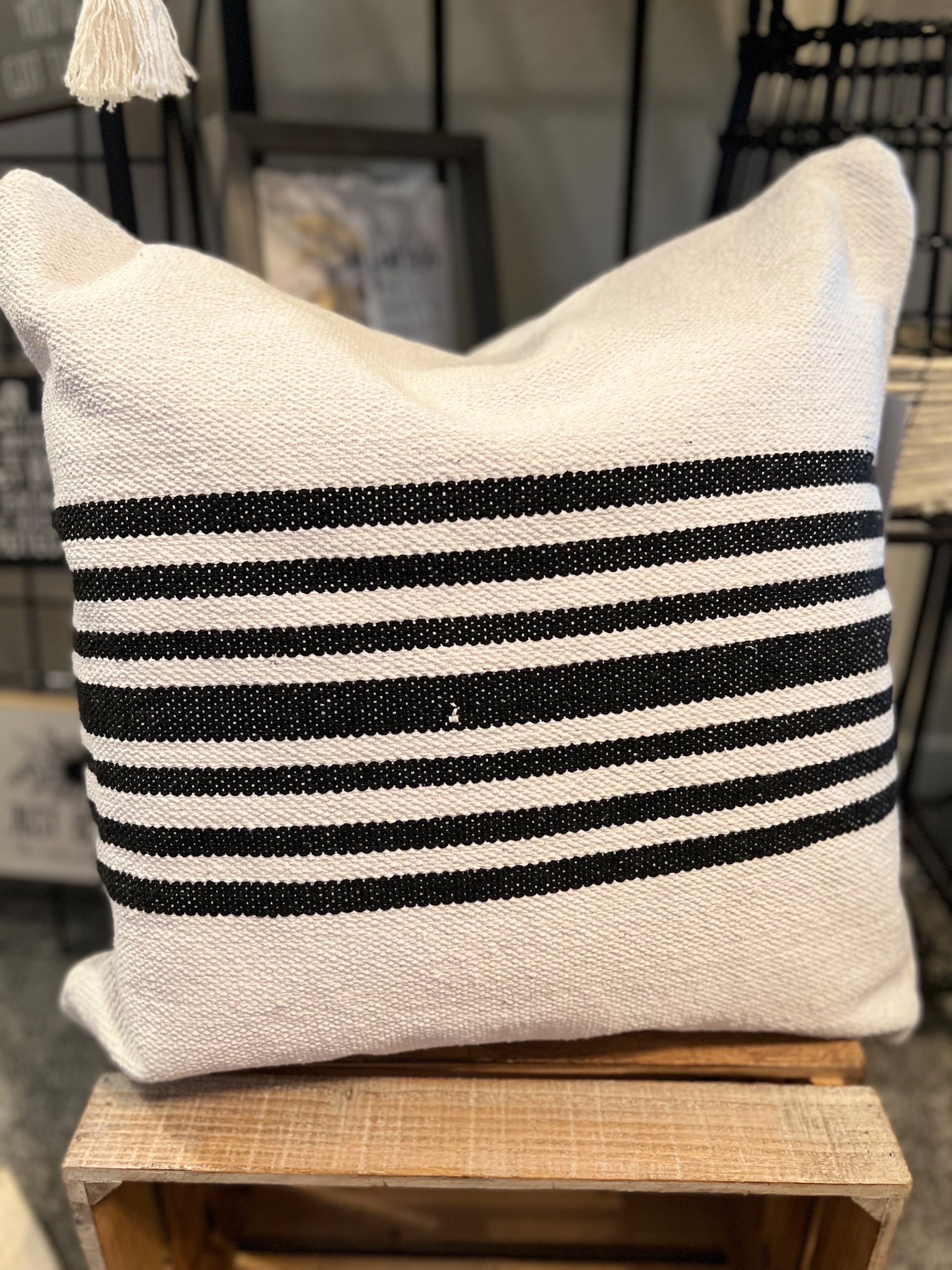 A bold statement piece, the Bold Black Striped Handwoven Throw Pillow is a surefire way to spruce up any space! Made with handcrafted luxury in mind, its simple striped design provides master craftsmanship and eye-catching elegance. It'll make a wonderful addition to your home as it offers comfort without compromising style. Soft to the touch and full of plushness, you can place it on your bed or couch for added flair. Make room in your décor for this beautiful pillow - you won't regret it!