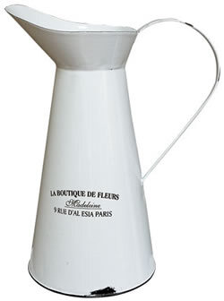 The Enamelware Carafe adds a classic touch to kitchen or bath displays. Metal carafe with distressed white enamel coating, and a provincial-styled "La Boutique De Fleurs" stencil on the side. 10" H with 5" diameter base, holds approximately 1-1/2 pints.