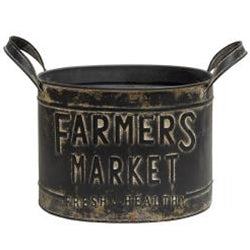 Farmers Market Bucket is a distressed, rusty metal bucket with handles. This dark charcoal colored bucket features the phrase, "Farmers Market - Fresh & Healthy," in embossed lettering. Fill with florals for a country bouquet, or use as storage to organize supplies or odds and ends! Measures 8" wide by 6" high and 6.5" deep (not including handles). Item is for decorative use only.