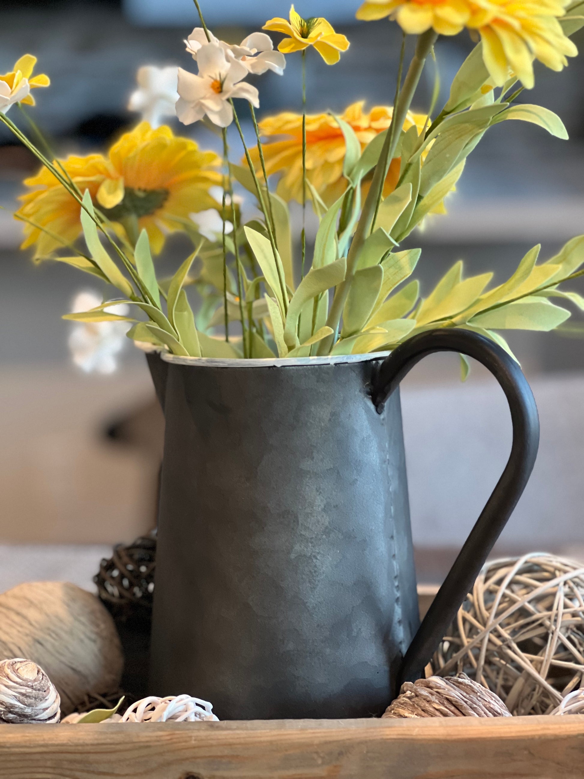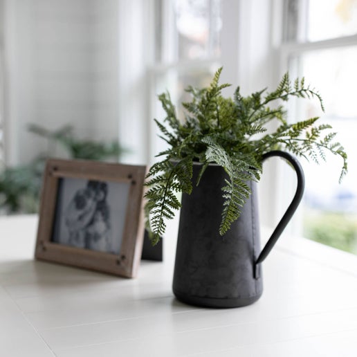 Inspired by a traditional farm pitcher, this black galvanized vase is modernized with a matte enamel-like white interior. Being both durable and stylish, use this modern farmhouse vase for displaying your faux greens, botanicals, or stems. Could also use as a standalone accent on a tabletop or shelf decor vignette.