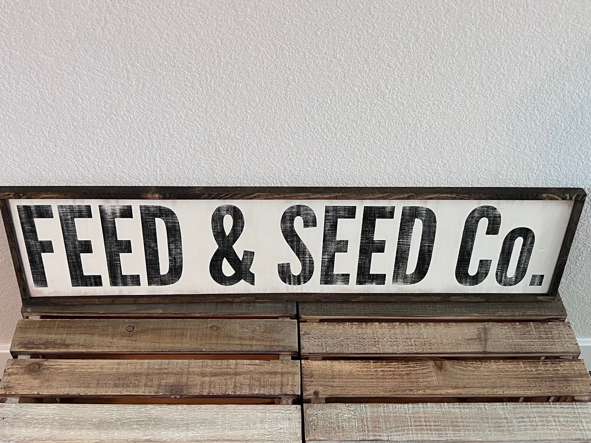 - Feed and Seed sign, off white and black lightly distressed and framed in dark stained wood.