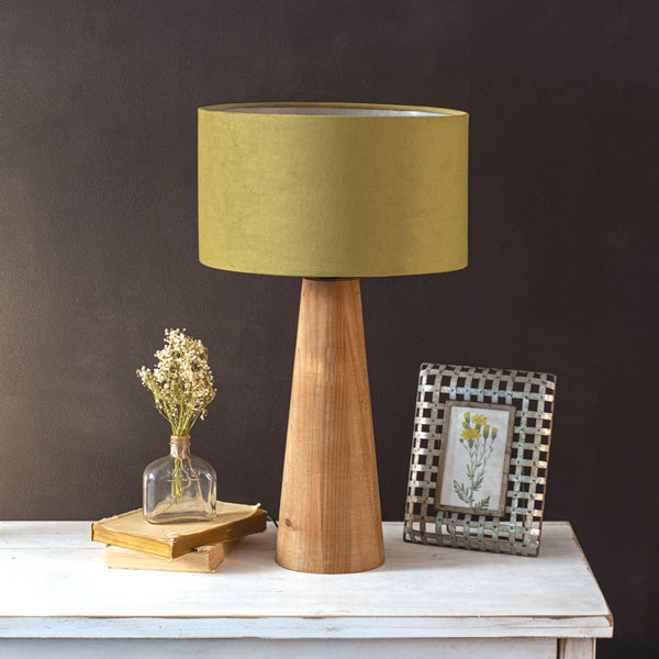 Our Felix Wood Table Lamp is made out of wood and includes one velvet textured drum shade with attached harp. This lamp features and on/off rocker switch on the cord. It requires a standard light bulb, not included. 60-watts is the maximum suggested bulb wattage for this item. Shade: 14'' dia. x 8''H; Base: 5¾'' dia. x 17½''H.