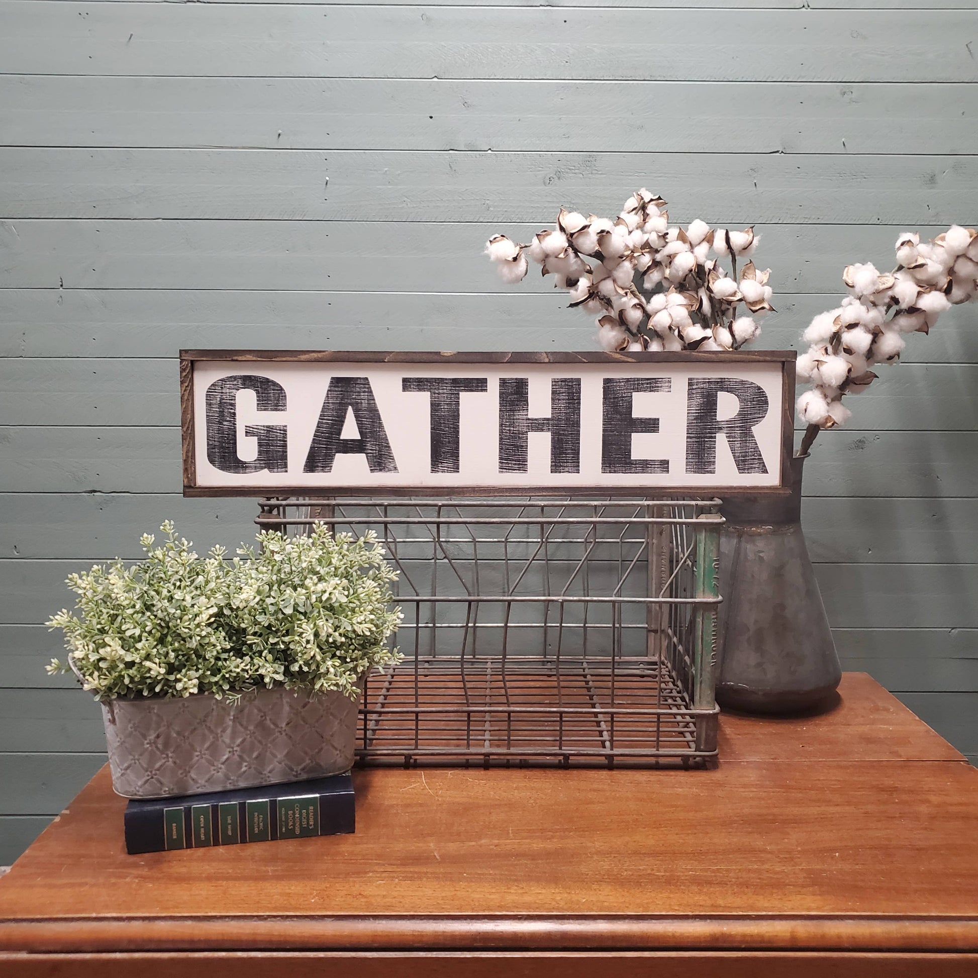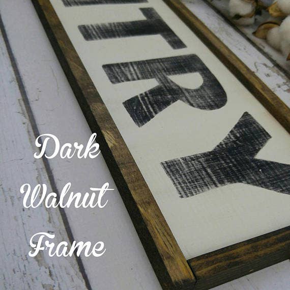 This off-white and black GATHER sign is lightly distressed and framed in a dark stained wood frame measuring 33 x 8 inches. The sign comes ready to hang with two sawtooth hangers, but please note that due to its handmade nature, there may be some variations from the photos, such as spots of distressing, knots, or imperfections in the paint. These characteristics should not be seen as flaws, but rather as proof of the unique and one-of-a-kind nature of this product.