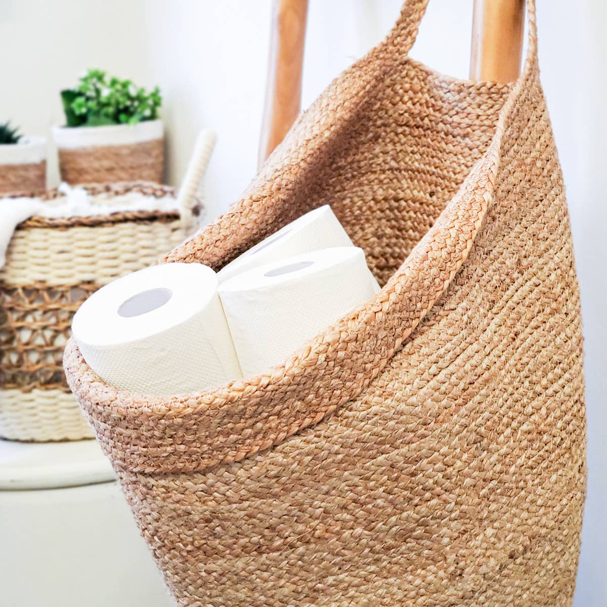 This handwoven natural jute wall storage basket from KORISSA is more than just an organizational tool - it adds warmth and a touch of textural richness to any space. Measuring approximately 19" tall with a 12" round bottom and a 15.5" round top, this basket is crafted by Fair Trade artisans in Bangladesh using 100% braided jute. Due to its handmade nature, each basket may vary slightly in design, color, and size. To care for this item, dust or vacuum regularly and wipe with a damp cloth if necessary. Avoid rubbing stains or spills and make sure to dry properly after water damage. Keep out of direct sunlight to prevent color fading.