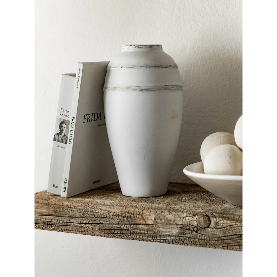 This minimal urn-shaped vase features accent rings overlaid in gold and a wide mouth making it ideal for displaying branches or arching botanicals.