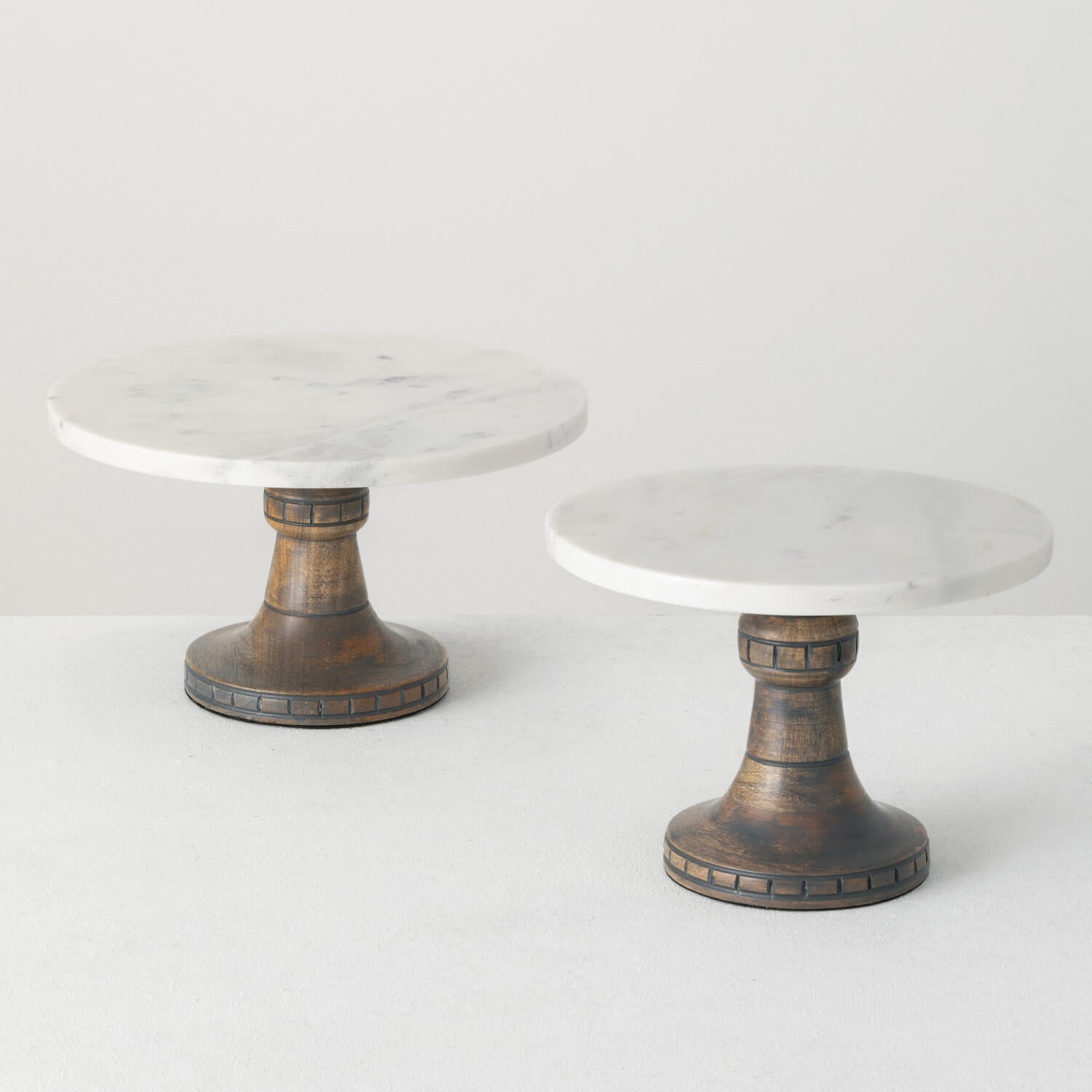 - This pair of 7" high pedestals feature a gray-washed wood base and an amazing marble top. Perfect for putting those tasty treats on display. Ideal for hosting.
