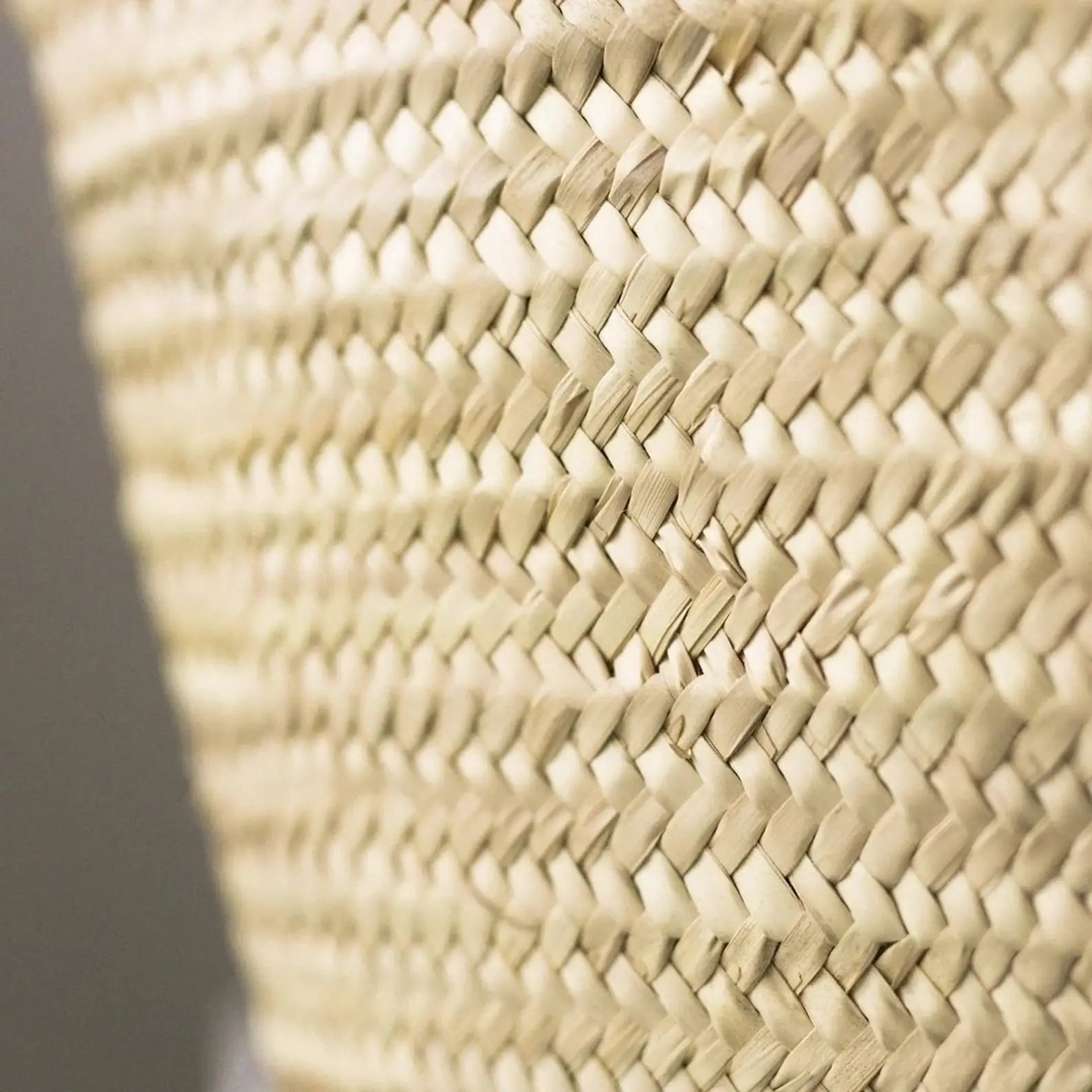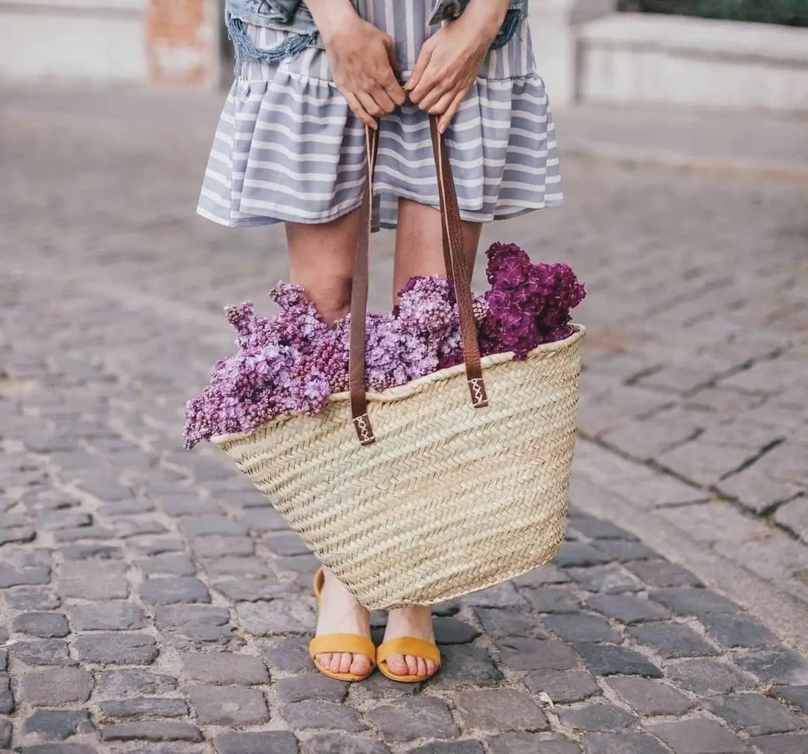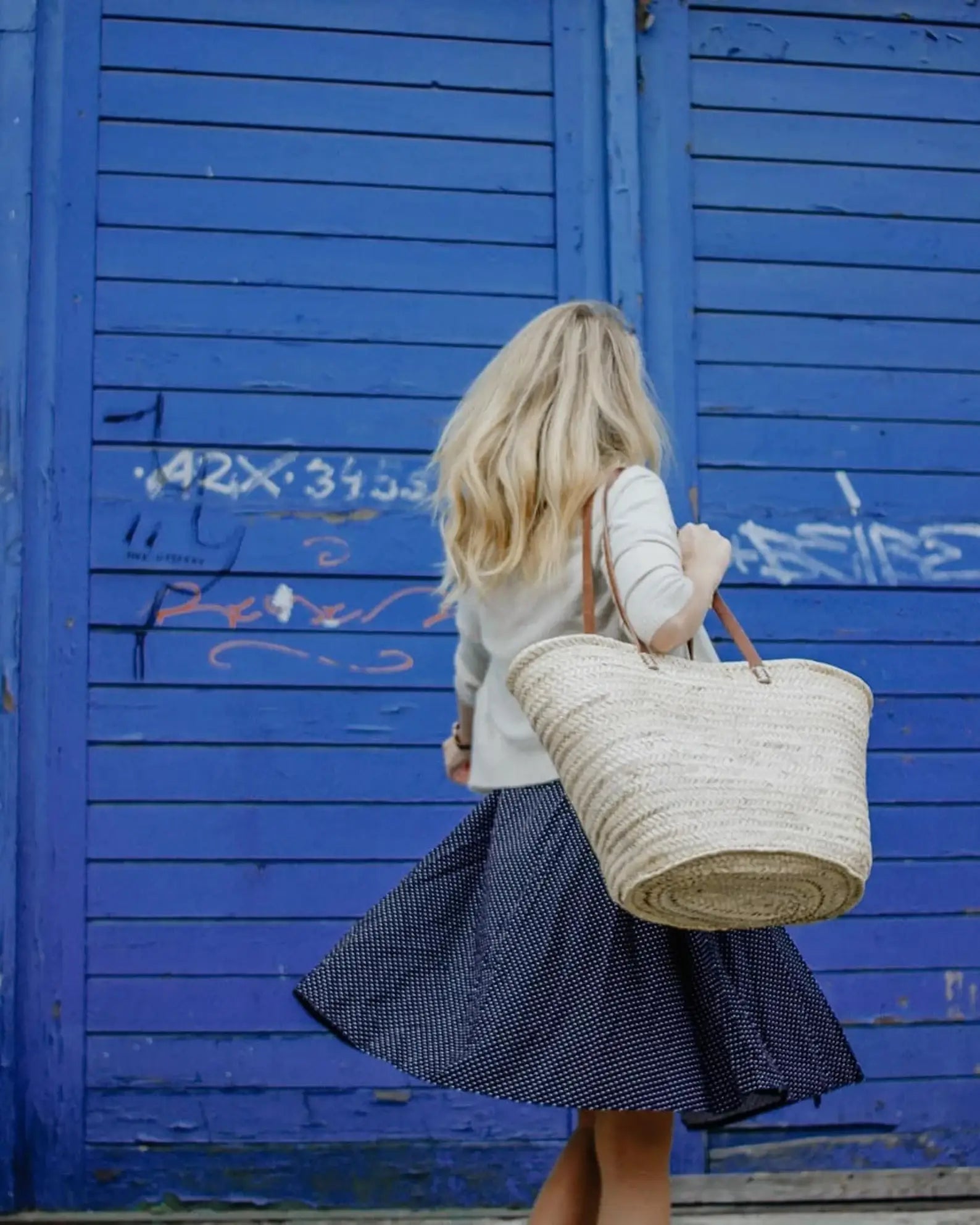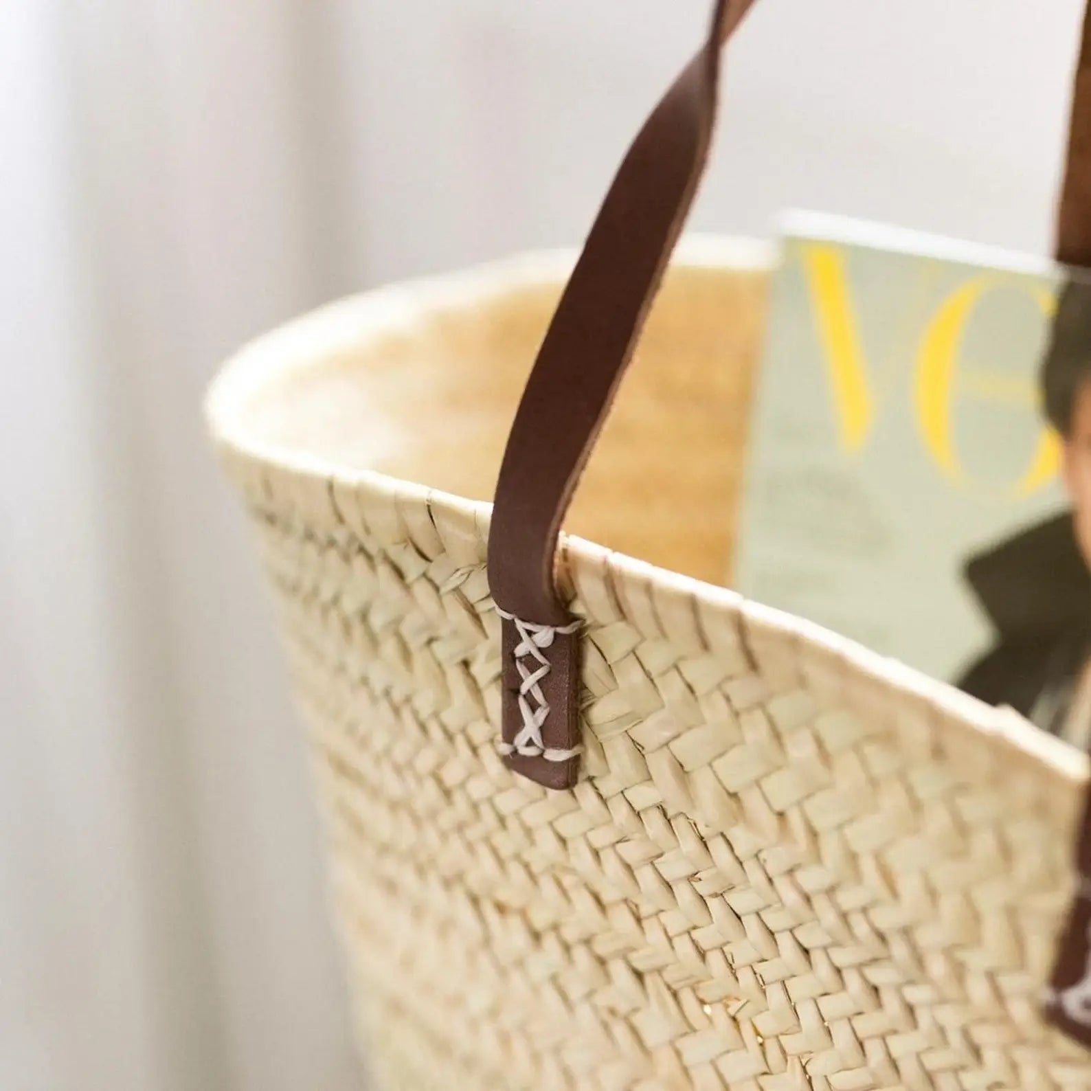 This French market classic is expertly handwoven in Morocco using date palm leaves, creating a sturdy herringbone texture. It boasts leather tabs and doubled straps, making it versatile as both a tote and shoulder bag. Perfect for the beach, farmers market, or family picnic, it's also great for storing magazines and small blankets at home. Measuring 22 in / 56 cm at the top, 13.3 in / 34 cm at the bottom, and 14.1 in / 36 cm in height, it's a timeless and stylish option. Made with date palm leaf and leather, it features a double-woven top edge for extra durability. Please note: Due to their handmade nature, these French baskets may have slight imperfections, which only adds to their character.