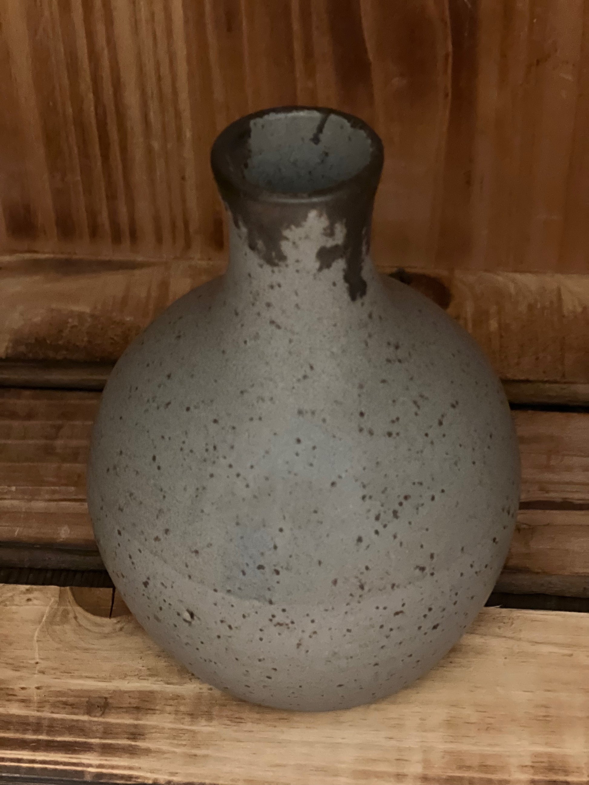 This vase was handcrafted with brown stoneware clay and finished in a matte glaze with bronze accents.