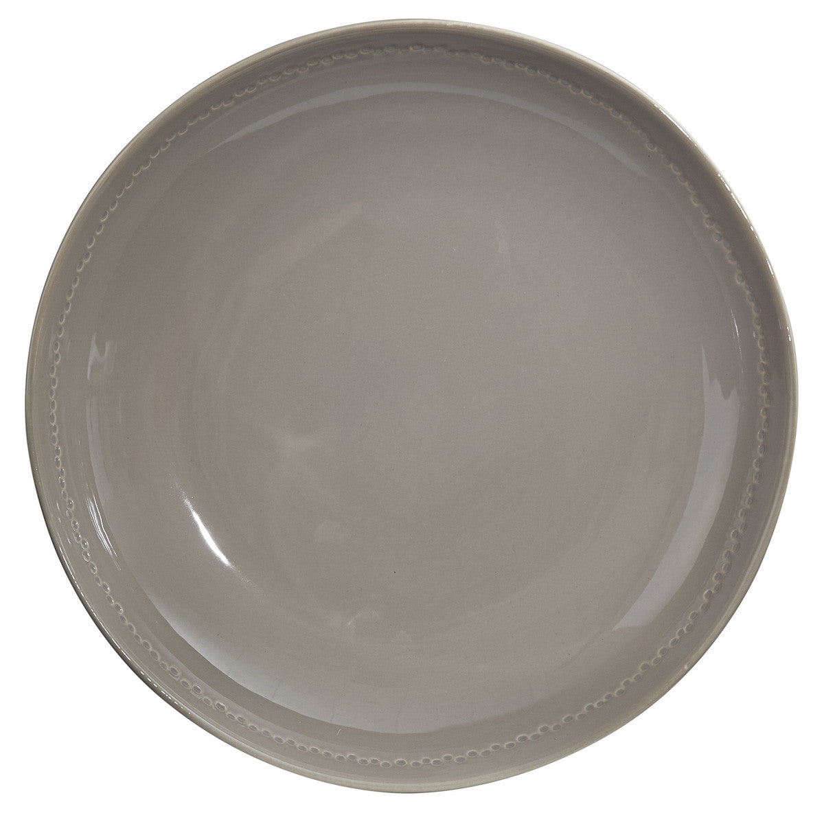 Offering generous portions, the PEYTON SERVING PLATTER - STONE features organic hand-modeled shapes with a delicate beading around the edges. This dinnerware is conveniently dishwasher and microwave safe. Dimensions: 13" dia.