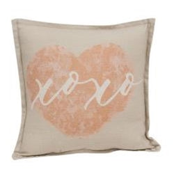 XOXO On Heart Pillow is a stuffed fabric pillow that reads, "XOXO" in white script text over a pink watercolor-style heart on a beige background.