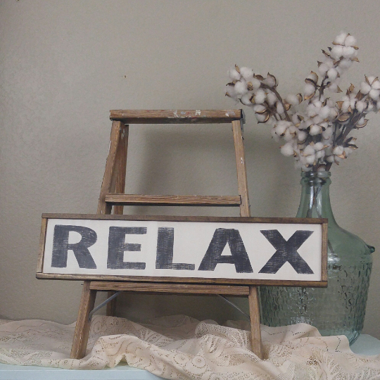 Get the perfect home decor piece with this chic and stylish “Relax” sign. It has an off white background with black lettering, distressed and framed in a dark walnut frame. Dimensions are 25x6 inches for the perfect addition to any room!
