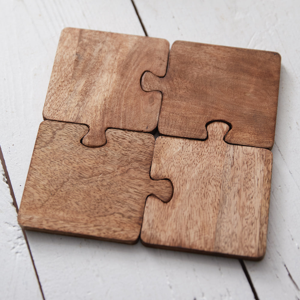 The only thing puzzling is how were able to create such adorable coasters! Our puzzle coasters are the perfect addition to a coffee table and will spark conversation over their uniqueness. Place puzzle pieces together to create a mat for small dishes and more. Coasters are made of wood. When puzzle coasters are formed into a mat, it measures 7''W x ¼''D x 7''H.