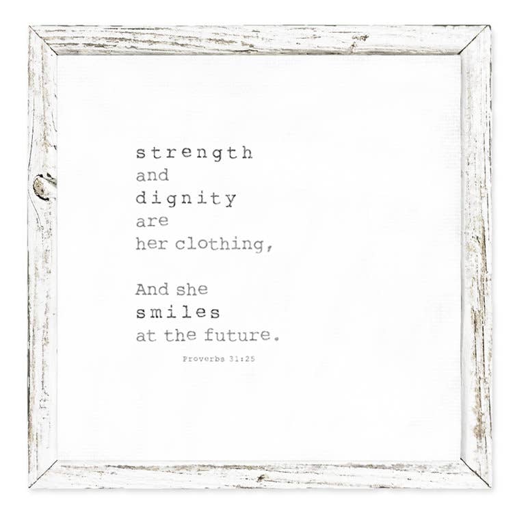 White framed shelf art - that reads Strength and Dignity. Shelf art