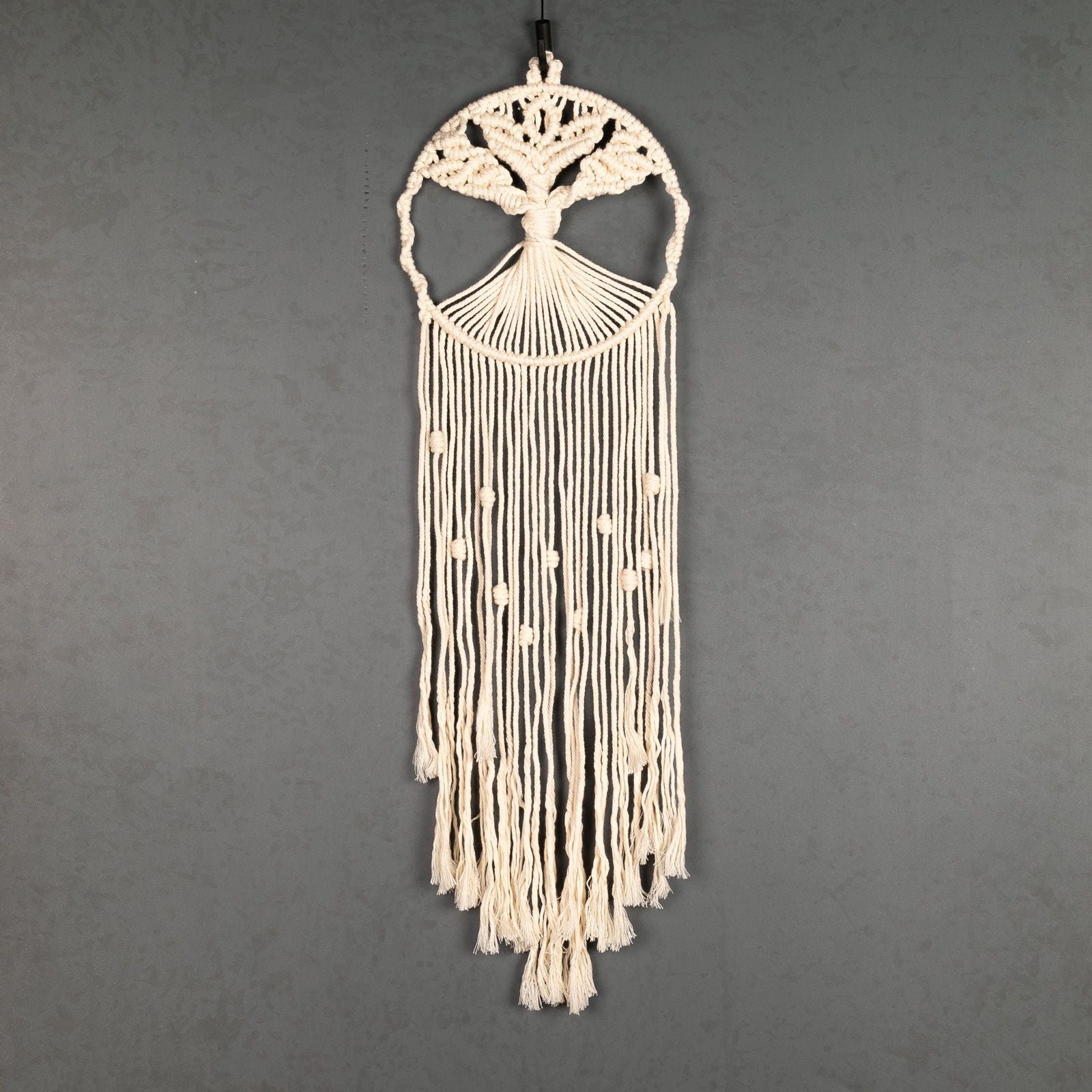 This macrame wall hanging featuring the Tree of Life design is the perfect way to brighten any space. Hand-knotted with love, this piece measures 9" x 25" and has an elegant off white color. This wall decor is durable and can be easily maintained with gentle hand washing. Crafted in India, this is a timeless art form that will bring admiration from all who see it.