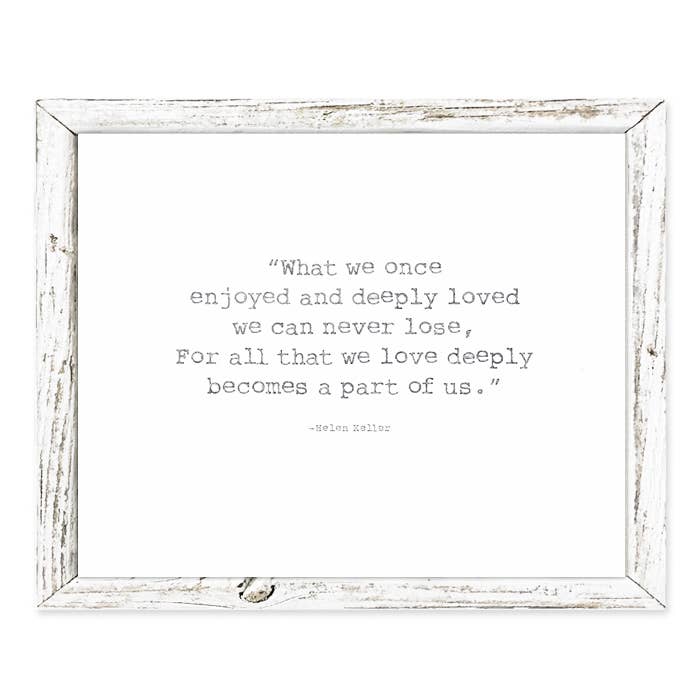 This 'What We Once Enjoyed' Hellen Keller - Shelf Art features a giclée print on premium artist canvas, expertly framed with weathered wood in a natural gray or rustic antique white finish. Each piece is custom made to order for a truly unique addition to your decor.