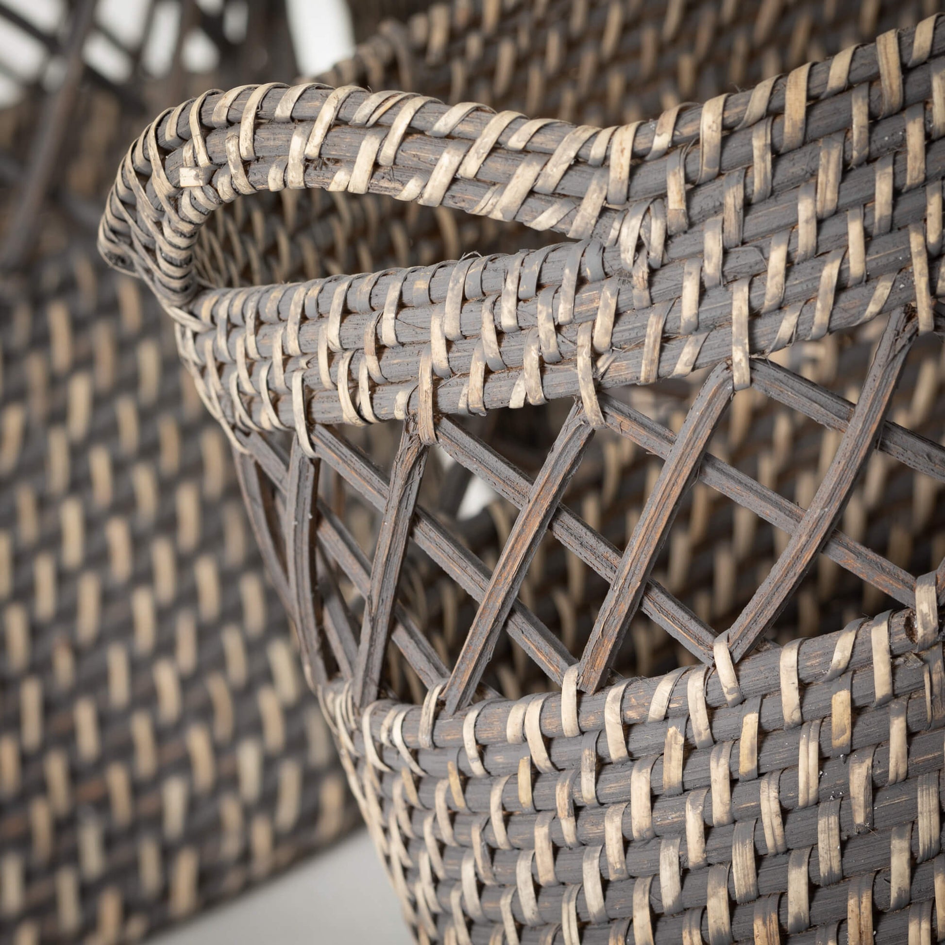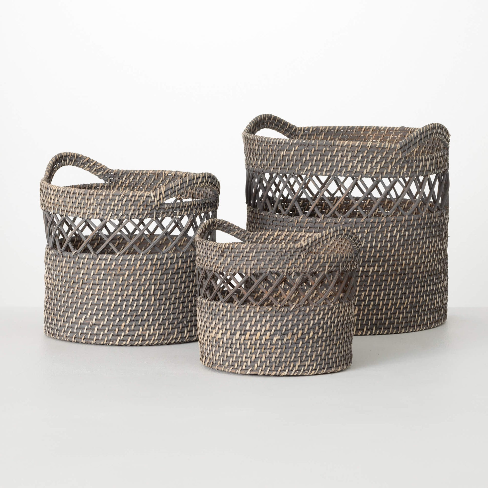 This set of Woven Baskets includes three different sizes: 15"L x14.5"W x14", 13.5"L x12"W x10.5", and 11"L x10"W x8". Each basket is made of natural materials and weighs just over 2.5 pounds combined. The neutral gray color complements any decor, making these baskets a perfect match for your faux trees. Additionally, this product meets Prop 65 standards.